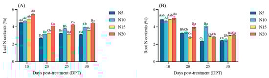 As shown in Figure 5, N content in both leaves and roots peaked at 10 DPT across all treatments. Subsequently, the nitrogen contents in the leaves of each treatment were significantly reduced after 20 DPT, which was reduced by 39.29%, 32.77%, 32.89%, and 24.57%, respectively, compared with 10 DPT (p < 0.05), and then each treatment was significantly increased; during the whole treatment period, N20 maintained nitrogen advantage. In roots, N content in N20 was significantly higher than in other treatments on 20 DPT (p < 0.05); however, its advantage diminished progressively, with all treatments converging to stable levels by 30 DPT (N20 > N15 > N10 > N5).