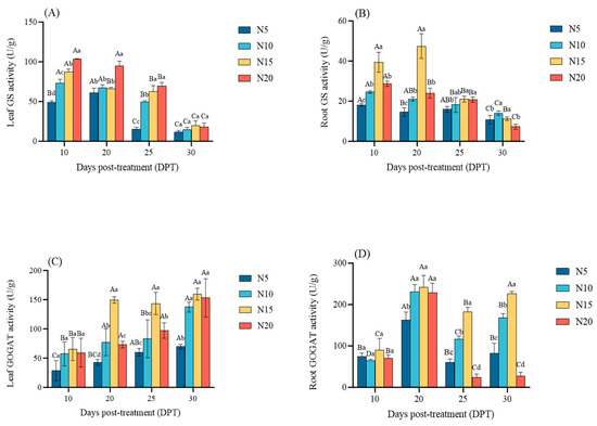 Nitrogen-dependent regulation of nitrogen assimilation enzymes in sugar beet at 10, 20, 25, and 30 DPT. (A) leaf glutamine synthetase (GS) activity, (B) root GS activity, (C) leaf glutamate synthase (GOGAT) activity, (D) root GOGAT activity. Different lowercase letters indicate that there are significant differences in different nitrogen concentrations on the day; different capital letters indicated that the same N concentration was significantly different at different times, p < 0.05.