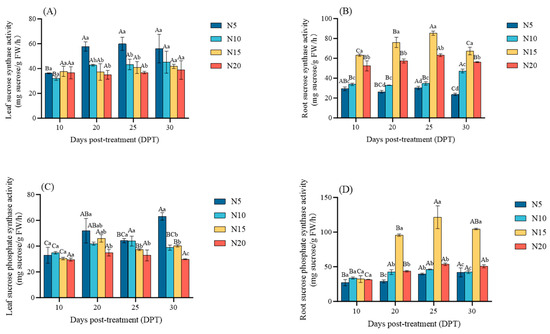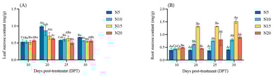 Sucrose accumulation profiles in response to nitrogen availability at 10, 20, 25, and 30 DPT: (A) leaf sucrose content, and (B) root sucrose content. Different lowercase letters indicate that there are significant differences in different nitrogen concentrations on the day; different capital letters indicated that the same N concentration was significantly different at different times, p < 0.05.