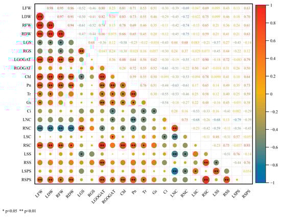 Correlation analysis of measured phenotypic and physiological parameters. Red/blue circles denote positive/negative Pearson correlation coefficients; asterisks indicate significance levels (* p < 0.05, ** p < 0.01). LFW, leaf fresh weight; LDW, leaf dry weight; RFW, root fresh weight; RDW, root dry weight; LGS, leaf GS activity; RGS, root GS activity; LGOGAT, leaf GOGAT activity; RGOGAT, root GOGAT activity; Chl, total chlorophyll; Pn, net photosynthetic rate; Tr, transpiration rate; Gs, stomatal conductance; Ci, intercellular CO2 concentration; LNC, leaf nitrogen content; RNC, root nitrogen content; LSC, leaf sucrose content; RSC, root sucrose content; LSS, leaf SS activity; RSS, root SS activity; LSPS, leaf SPS activity; RSPS, root SPS activity.