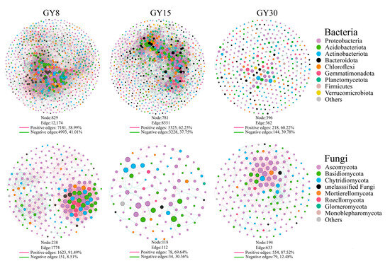 4.2. Continuous Cropping Decreased the Complexity of Bacterial Networks and Modified the Structure of Fungal Networks