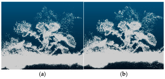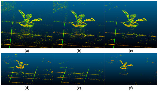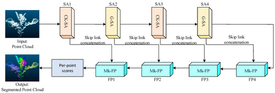 - A preprocessing step is performed on the generated point cloud, combining statistical outlier removal (SOR) [33] and radius outlier filter (ROL) [34] to remove noisy and abnormal point clouds, and then using the RANSAC [35] algorithm to segment the target plant point cloud. Based on the preprocessed point cloud, segmentation is performed using the improved CKG-PointNet++ model. The fine-grained geometric and local semantic information in the point cloud is effectively captured at the feature extraction (SA) layer, and the global information is gradually integrated while maintaining the local details. The local information is effectively integrated with the global context in the feature propagation (FP) layer to improve the overall expression capability and segmentation accuracy.