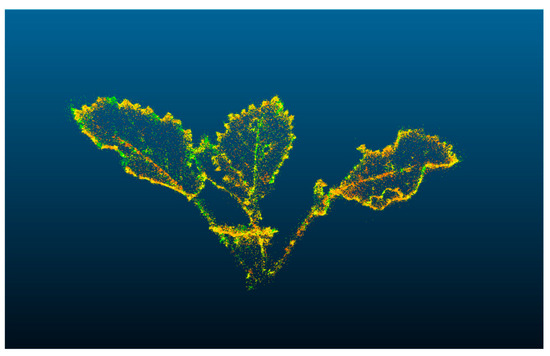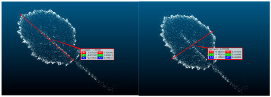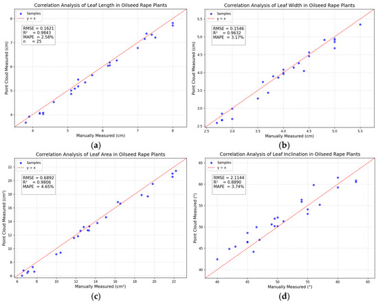 - Key phenotypic features, such as plant height, leaf length, leaf width, leaf area and leaf inclination, were calculated based on the segmented oilseed rape point cloud. The results are compared and analyzed with the real measured phenotypic parameters to assess the measurement accuracy and reliability of the process.