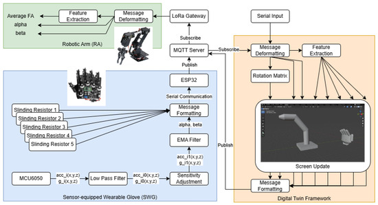 The seven samples collected from hand movements by the SWG are acquired at a frequency of 50 Hz, meaning every 20 ms, and transmitted to both the DT and the physical RA. Both recipient devices receive the seven values: two correspond to the palm tilt angles and , which are immediately ready to use, while the remaining five are FIs, represented as dimensionless values ranging between 500 and 2500.