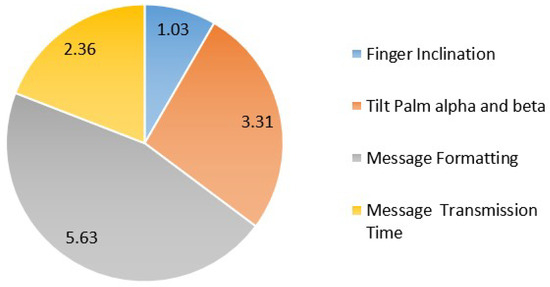Specifically, we measured the delays introduced by the SWG in sensing the FI, sensing and processing the tilt angles of the palm, formatting the message, and transmitting it. Figure 7 shows the corresponding numerical values in milliseconds for comparison.