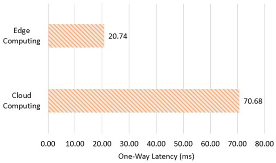 Finally, Figure 9 illustrates the one-way latency introduced by the network architecture in the two scenarios previously described, where the MQTT broker and the Node-RED computing server are deployed either at the edge or in the public cloud. Specifically, in the scenario involving the public cloud, a virtual machine was instantiated to host the Node-RED server and the MQTT broker, which was implemented using Mosquitto.