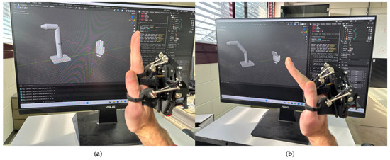 On the other hand, the DT receives the same input values as the physical RA (either via MQTT messages from the SWG in Real2Digital mode or through serial communication in the other two modes) and updates the 3D model of the RA. It computes the inclination angles of the first and second arms, as well as the gripper’s opening and closing, mirroring the behavior of the physical RA. Additionally, the DT updates the 3D model of the hand (including fingers and palm) using the individual FAj values, along with and , ensuring that the relative positions of all components are correctly updated through the Rotation Matrix (RM) defined in Equation (4).
