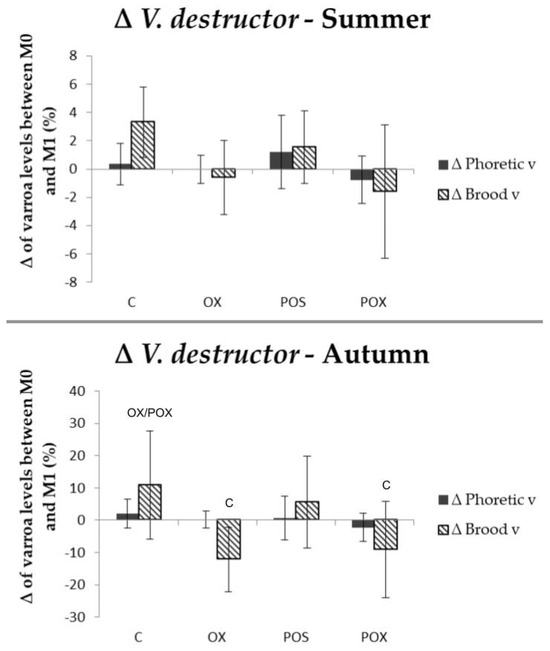 The levels of infestation by V. destructor at M0 and M1 for each study group are included in Table 1, as well as their variations between the two monitoring periods, for summer and autumn experiments. Generally, the changes in brood infestation levels in the experiment were more noticeable than those in PVD.