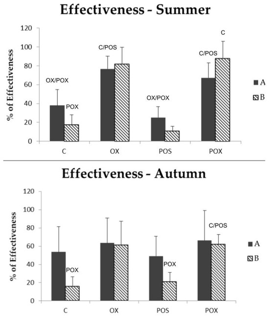 Secondly, Ef A was similar for all the treatments in autumn, including the C group, and did not show statistical differences among them. However, regarding Ef B, the POX treatment showed a significantly higher efficacy than C (K = 15.56; p-value = 0.007) and POS (K = 15.56; p-value = 0.002) (Figure 2).