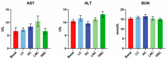 The liver index of the LNC group was significantly higher than that of the other groups (Table 4). However, the results indicated no significant changes in the concentrations of the AST and ALT enzymes and BUN in the serum of different treatment groups (Figure 1).