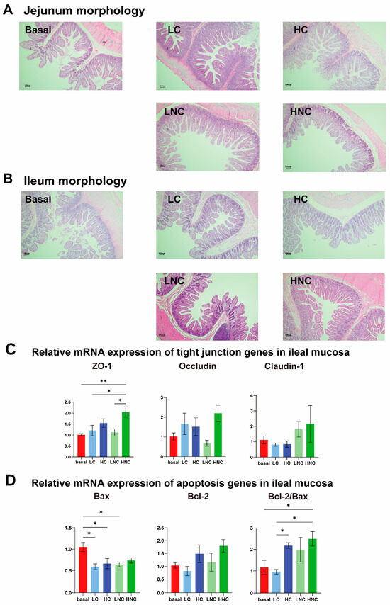 A dosage of 150 mg/kg of nano-copper significantly upregulated the mRNA expression of ZO-1, one of the key tight junction proteins, suggesting a potential enhancement of epithelial barrier integrity under heat stress conditions (Figure 2C). All copper treatments led to a significant decrease in the mRNA expression of Bax, with the Bcl-2/Bax ratio notably increased in the HC, LNC, and HNC groups, indicating an improved anti-apoptotic capacity in the ileum under heat stress conditions (Figure 2D).