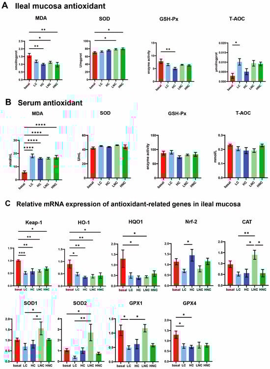 The results indicate that both copper sulfate and nano-copper supplementation enhanced the antioxidant capacity of the ileal mucosa in weanling pigs. Compared to the basal group, MDA concentrations in the jejunal mucosa were significantly lower in the HC, LNC, and HNC groups (p < 0.05, p < 0.01, Figure 3A), suggesting reduced lipid peroxidation. Additionally, both nano-copper treatments (LNC and HNC) significantly increased SOD activity in the mucosa compared to the control (p < 0.05), although no significant differences were observed in GSH-Px or T-AOC. Interestingly, GSH-Px activity was significantly decreased in the HC group (p < 0.01), indicating a potential adverse effect of high-dose copper sulfate on this antioxidant enzyme.
