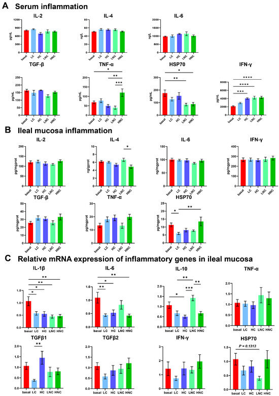 The results indicate that copper supplementation can modulate intestinal inflammation in weanling pigs under heat stress. Compared to the basal group, all copper-supplemented treatments significantly increased serum IFN-γ concentrations (p < 0.001, Figure 4A). Additionally, serum TNF-α was significantly elevated in the high-dose nano-copper group (HNC) compared to the other treatment groups (p < 0.05), suggesting that excessive copper nanoparticle supplementation may induce a pro-inflammatory response. In terms of heat stress alleviation, serum HSP70 levels were significantly reduced in both LC and HNC groups compared to the basal group (p < 0.01, Figure 4A), while mucosal HSP70 concentrations were also decreased in the LC group (p < 0.01, Figure 4B). These findings indicate that both low- and high-dose nano-copper may contribute to improved stress resilience. At the mRNA level in the ileal mucosa (Figure 4C), supplementation with both copper sulfate and nano-copper significantly downregulated the expression of pro-inflammatory cytokines IL-1β and IL-6 (p < 0.05 or p < 0.01) compared to the basal group. Furthermore, IL-10 expression was significantly higher in the LC group compared to the HC, LNC, and HNC groups (p < 0.01), suggesting that low-dose nano-copper may exert a more pronounced anti-inflammatory effect than other treatments.