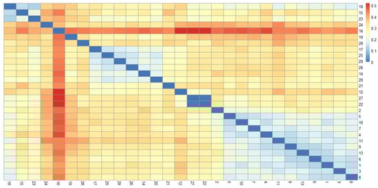 The genotypic dataset of 29 accessions comprised 32,895 molecular markers, including 32,798 single nucleotide polymorphisms (SNPs), 38 deletions (DELs), and 59 insertions (INSs). Among the SNP markers, 4783 exhibited monomorphic variation (single allele), while 28,015 polymorphic SNPs (with >1 allele) were retained for subsequent analyses.