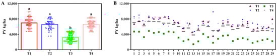 Yields of different treatments and samples in 2022. (A) Plot yield (PY) under different fertilizer treatments. (B) PYs of different combinations of fertilizer treatments and cultivars. The a, b indicate significant differences at p < 0.05. (T1 (N120P100K100), T2 (N96P100K100 + bio-organic fertilizer), T3 (N0P0K0),T4 (Longfutianxia slow-release fertilizer)).