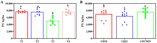 Yields of different treatments and samples in 2023. (A) Plot yield (PY) under different fertilizer treatments. (B) PYs of different cultivars. The a–c indicate significant differences at p < 0.05. (T1 (N120P100K100), T2 (N96P100K100 + bio-organic fertilizer), T3 (N0P0K0),T4 (Longfutianxia slow-release fertilizer)).