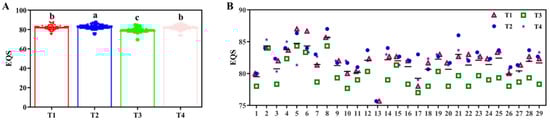 Taste values for different treatments and samples in 2022. (A) Eating quality score (EQS) under different fertilizer treatments. (B) EQSs of different combinations of fertilizer treatments and cultivars. The a, b, c indicate significant differences at p < 0.05. (T1 (N120P100K100), T2 (N96P100K100 + bio-organic fertilizer), T3 (N0P0K0),T4 (Longfutianxia slow-release fertilizer)).