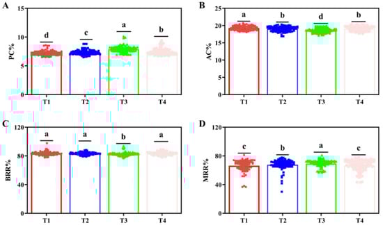 Nutritional and processing-related indicators for different fertilizer treatments in 2022. (A) Protein content (PC), (B) Amylose content (AC), (C) Brown rice recovery rate (BRR), and (D) Milled rice recovery rate (MRR) under different fertilizer treatments, respectively. The a, b, c, and d indicate significant differences at p < 0.05. (T1 (N120P100K100), T2 (N96P100K100 + bio-organic fertilizer), T3 (N0P0K0),T4 (Longfutianxia slow-release fertilizer)).