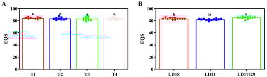 Taste values for different treatments and samples in 2023. (A) Eating quality score (EQS) under different fertilizer treatments. (B) EQSs of different cultivars. The a, b indicate significant differences at p < 0.05. (T1 (N120P100K100), T2 (N96P100K100 + bio-organic fertilizer), T3 (N0P0K0),T4 (Longfutianxia slow-release fertilizer)).