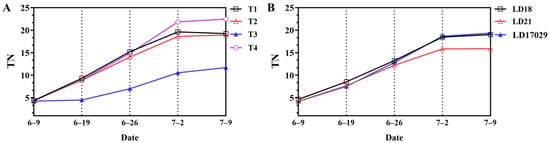 Effects of different fertilization treatments on tillering. (A) Tillering number (TN) under different fertilizer treatments. (B) TNs of different cultivars.