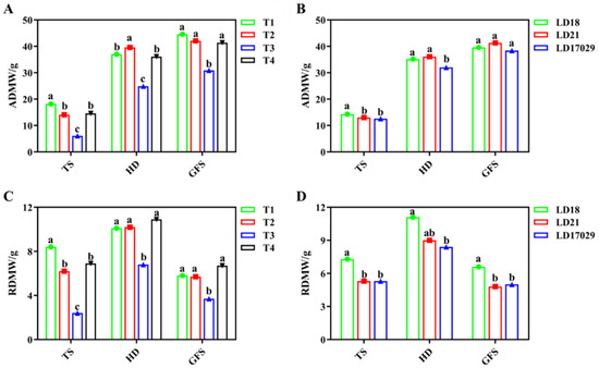 Effects of fertilizer treatments on dry matter accumulation. (A) Aboveground dry matter weight (ADMW) under different fertilizer treatments. (B) ADMWs of different cultivars. (C) Root dry matter weight (RDMW) under different fertilizer treatments. (D) RDMWs of different cultivars. The a, b, c indicate significant differences at p < 0.05. TS: (Tillering Stage), HD: (Heading Date), GFS: (Grain Filling Stage).