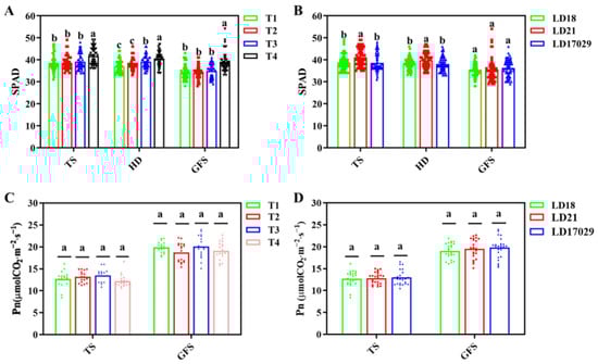 Effects of fertilizer treatments on SPAD (leaf color value) values and photosynthetic rate. (A) SPAD under different fertilizer treatments at the tillering stage (TS), heading date (HD) and grain-filling stage (GFS). (B) SPAD values of different cultivars at the tillering stage (TS), heading date (HD) and grain-filling stage (GFS). (C) Net photosynthetic rate (Pn) under different fertilizer treatments at the tillering stage (TS) and grain-filling stage (GFS). (D) Pn of different cultivars at the tillering stage (TS) and grain-filling stage (GFS). The a, b, c indicate significant differences at p < 0.05.