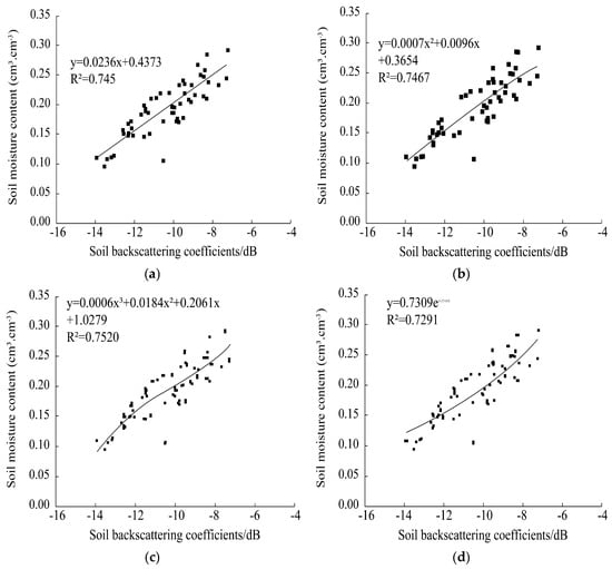 Comparison of regression models for VV-polarized backscatter versus surface soil moisture content. Soil moisture content (x-axis) is shown in cm3·cm−3; backscattering coefficients (y-axis) are shown in dB. Model equations and fit statistics are displayed in each subplot. (a) Linear model, (b) Quadratic curve model, (c) Trigonometric curve model, and (d) Exponential model.