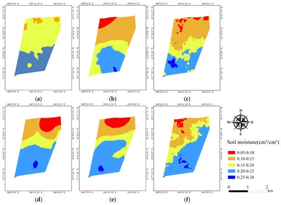 Estimated surface soil moisture distribution across the study area for the growing season of 2021: (a) April, (b) May, (c) June, (d) July, (e) August, and (f) September. Soil moisture values are expressed in cm3·cm−3. Note: The color scales vary between maps. Areas with higher soil moisture are shown in blue and lower values in red.