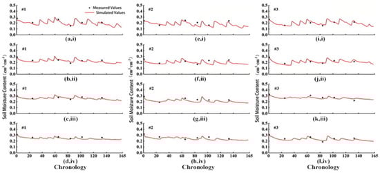 Comparison of simulated and observed soil moisture content at four depths—(i) 0–20 cm, (ii) 20–40 cm, (iii) 40–60 cm, and (iv) 60–80 cm—for sites 1 to 3 using the calibrated HYDRUS-1D model. Each column of subplots corresponds to one site: (a–d) site 1, (e–h) site 2, and (i–l) site 3. Measured soil moisture is shown as black dots, and simulated values are plotted as red lines. Axes are uniform across subplots for comparability.