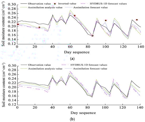 This investigation showed that the simulation precision of the HYDRUS-1D model was significantly enhanced for layered soil moisture through the integration of observational data with the ensemble Kalman filtering algorithm. This study further examined the impacts of ensemble dimensionality and the observational error magnitude on the accuracy of soil moisture estimations. The results demonstrated that moderately increasing the ensemble size effectively diminishes the root mean square error (RMSE) of soil water simulations, whereas excessively large ensembles led to negligible improvements in accuracy while compromising the computational efficiency. Additionally, the observational error exerted a substantial influence on the accuracy of soil moisture estimations, with reduced error values correlating directly to a lower simulation RMSE. Current research predominantly validates data assimilation techniques by comparing model simulations, assimilated analyses, and measured values. This study uniquely investigates whether temporal assimilation processes enhance the forecasting accuracy. After incorporating assimilation-predicted values into comparative analyses, the findings reveal that these forecasts exhibit closer alignment with observed values than standalone HYDRUS-1D predictions, thereby confirming that current-time assimilation is able to optimize model forecasts.