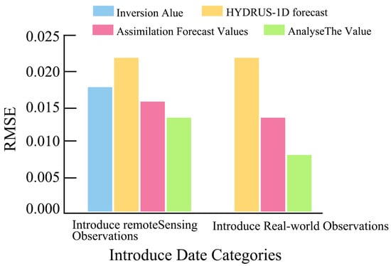 Root mean square error (RMSE) of surface soil moisture under two assimilation scenarios: (left) remote sensing observations and (right) in situ observations. Bars represent inversion values, HYDRUS-1D forecasts, assimilation forecasts, and assimilation analysis values.