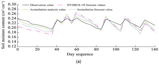 Following the optimized surface assimilation, the EnKF was extended to the 20–40, 40–60, and 60–80 cm layers using the same framework. Assimilation results (Figure 9) showed that model performance improved at all depths. The 20–40 cm layer exhibited moderate fluctuations due to irrigation and rainfall, while deeper layers were relatively stable. Though the assimilation effect diminished with depth, especially below 40 cm, accuracy still improved over the HYDRUS-1D baseline. The results depict the soil moisture assimilation for the 20–80 cm depth layers after incorporating in situ observations into the EnKF algorithm. Figure 9a presents the assimilation results for the 20–40 cm layer. Although soil moisture fluctuations remained evident, indicating sensitivity to external factors such as rainfall and irrigation, the magnitude of variation is less pronounced compared with the surface layer (0–20 cm). The HYDRUS-1D forecast values for this layer generally underestimated soil moisture compared with observations. After assimilation, the analysis values closely align with the observed data, and the assimilation forecasts are slightly more accurate than the HYDRUS-1D predictions, demonstrating an overall improvement in simulation accuracy. Figure 9b,c show the assimilation results for the 40–60 cm and 60–80 cm layers, respectively. Soil moisture at these deeper layers exhibits greater stability with smaller fluctuations, suggesting a reduced response to external influences such as precipitation and irrigation. As seen in the figures, HYDRUS-1D forecasts at these depths also tend to underestimate moisture levels. While data assimilation improves simulation accuracy for both layers, the enhancement is less significant compared with the upper layers (0–20 cm and 20–40 cm).