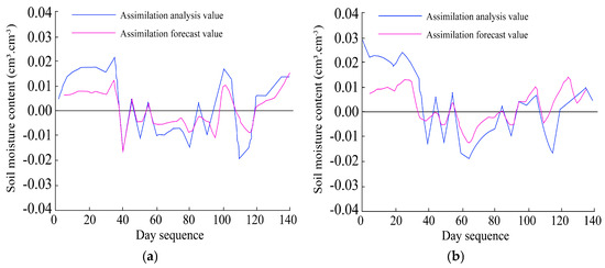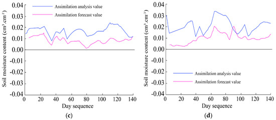 Differences between soil moisture analysis values and forecast values across dates at four soil depths. Each panel compares assimilation analysis and forecast outputs over the observation period. (a) 0–20 cm, (b) 20–40 cm, (c) 40–60 cm, and (d) 60–80 cm.