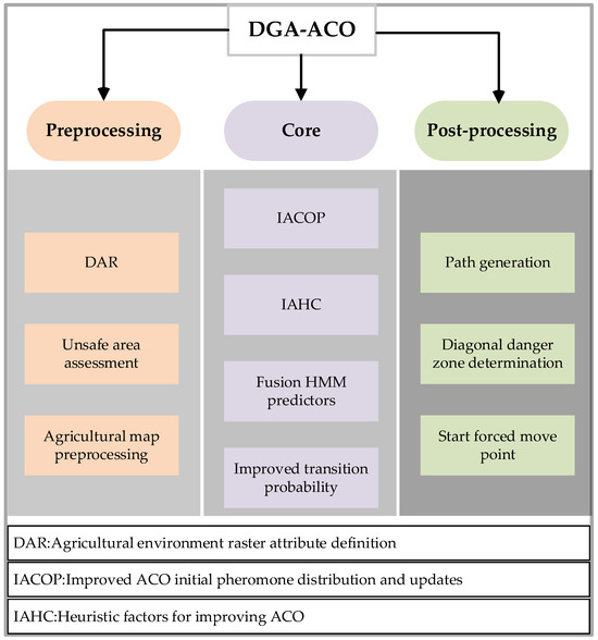 The DGA-ACO algorithm workflow is shown in Figure 2. It is mainly divided into three parts: one is a more detailed modeling of agricultural scenarios, the second is the main improvement of the GA-ACO algorithm for agricultural scenarios, and the third is the post-processing of unsafe nodes on the path.