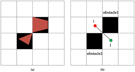 The agribot may encounter narrow spaces during operation. Path planning in narrow spaces is a challenge. Few scholars have studied the problem of safe obstacle avoidance in narrow spaces [36,37]. The specific analysis is as follows: As shown in Figure 4a, the brown polygon represents the obstacle before expansion. The top of the obstacle intersects at the diagonal line and occupies two grids after expansion; however, as shown in Figure 4b, the global path planning algorithm may plan a path from to , resulting in a collision risk when the agribot moves diagonally.