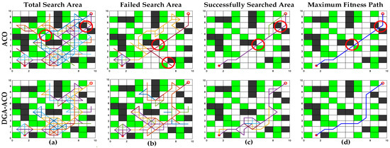 Experiments on ACO and DGA-ACO search and planning capabilities in a 10 × 10 agricultural simulation map. (a) Total search area; (b) failed search area; (c) successful search area; (d) maximum fitness path.