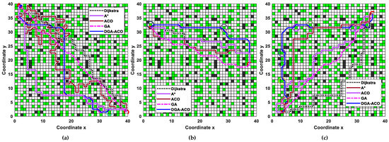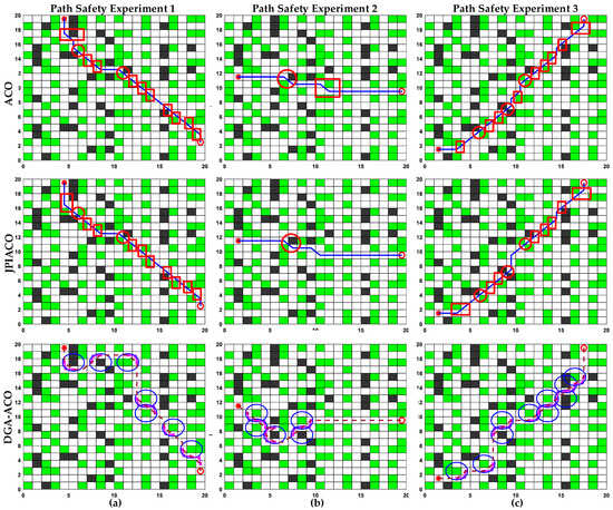 In Figure 7a (start: (4.5,19.5), goal: (19.5,2.5)), ACO’s optimal path passed through 2 narrow areas and 10 hazardous diagonal zones, while JPIACO [36] traversed 2 narrow areas and 10 hazardous diagonal zones. Figure 7b (start: (1.5,11.5), goal: (19.5,9.5)) shows ACO crossing one narrow area and one hazardous diagonal zone, versus JPIACO’s one narrow area. Figure 7c (start: (15,1.5), goal: (17.5,19.5)) recorded ACO passing three narrow areas and nine hazardous diagonal zones, compared to JPIACO’s three narrow areas and eight hazardous diagonal zones. Notably, DGA-ACO completely avoided these dangerous regions, demonstrating superior path safety.