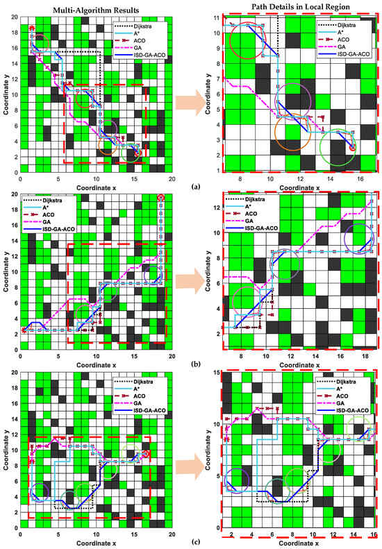 Our straight-corridor agricultural map was designed as a 20 × 20 grid with 47.25% obstacle coverage (34% plant grids and 13.25% other obstacles) according to reference [40], featuring several straight-corridor free spaces. Using the unified parameters from Table 3 (param8 settings for maximum iterations and population size), we conducted three representative experiments with start–goal pairs covering the entire map region. As shown in Figure 8 (left: algorithm comparison; right: local path details), Dijkstra’s algorithm and A* produced longer paths with frequent 90° turns, while conventional ACO and GA algorithms generated paths through multiple narrow spaces and potentially hazardous diagonal zones. In contrast, our algorithm achieved safer paths with sub-90° turns and shorter lengths while completely avoiding hazardous areas, demonstrating superior performance in both safety and efficiency metrics.
