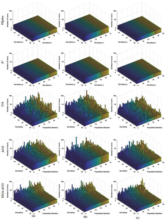 In Figure 10, the horizontal axis denotes the iteration number (1–50), the vertical axis denotes the population index (1–50), and the height (bar) represents the number of turns in the resulting path. The classical Dijkstra and A* algorithms produce perfectly flat turns: 16 and 14 turns in Figure 10a, 18 and 15 in Figure 10b, and 12 and 10 in Figure 10c. This reflects their guaranteed global optimality but zero adaptability or diversity in path shape. By contrast, the pure metaheuristics (GA and ACO) display large, irregular peaks and valleys; in early- to mid-stage searches their average turn counts reach 42.3 ± 10.8 (GA) and 47.5 ± 9.2 (ACO) in Figure 10a, 50.1 ± 12.2/53.4 ± 10.7 in Figure 10b, and 32.7 ± 8.1/38.2 ± 7.5 in Figure 10c, with occasional spikes up to 75–85 turns. Such volatility not only slows convergence but also risks settling in high-turn local optima. The proposed DGA-ACO dramatically attenuates these instabilities; across all three environments its mean turn counts fall to 33.1 ± 8.1 in Figure 10a, 36.4 ± 9.0 in Figure 10b, and 25.3 ± 6.2 in Figure 10c, reducing by 21.7–27.3% versus GA and 30.4–33.7% versus ACO while the maximum observed turns never exceed 60. Its standard deviation over the full grid is 7.8, approximately 25% lower than that of either GA or ACO, indicating a far smoother search trajectory. Moreover, by the “five-iteration <1% turn-count-change” criterion, DGA-ACO stabilizes in an average of only 10 iterations, compared to 15–20 iterations for the standalone metaheuristics.