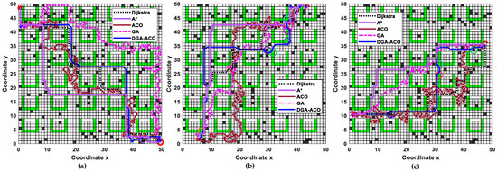 As shown in Figure 6, where the start point is marked by a red snowflake symbol and the goal by a red dot symbol, with red circles highlighting narrow regions potentially hazardous to robots as discussed in Section 2.2, DGA-ACO demonstrates superior performance due to its GA elite population’s prior knowledge and design, concentrating the search area along the start–goal connection line (Figure 6a). The failed and successful planning search areas in Figure 6b,c reveal DGA-ACO’s broader exploration range, attributable to its improved pheromone allocation/update mechanism through GA crossover-mutation factors and well-designed distance/angle functions.