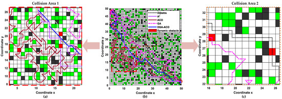 The motion patterns of dynamic obstacles are theoretically probabilistic in nature, yet demonstrate non-random movement characteristics due to inherent purposiveness, typically following activity- or location-specific behavioral patterns [42]. To validate the standalone DGA-ACO’s dynamic obstacle avoidance capability in plantation environments without hybrid local planners, we configured a dynamic obstacle at (1.5,1.5) with 1 m/s velocity, ±45° stochastic angular deviation orthogonal to the start–goal axis, and eight-directional transition states (forward/stop/turn). Figure 13 presents randomized experimental results with red rectangles marking dynamic obstacles, showing conventional algorithms’ critical safety failures: Dijkstra and A* collisions were at (25.5,26.5) and (16.5,17.5), respectively, and ACO/GA collisions at (16.5,28.5). In contrast, DGA-ACO successfully avoided proximal obstacles at (16.5,17.5) and (16.5,20.5), empirically confirming its enhanced safety compliance in unstructured dynamic environments with 100% collision avoidance without auxiliary path correction modules.