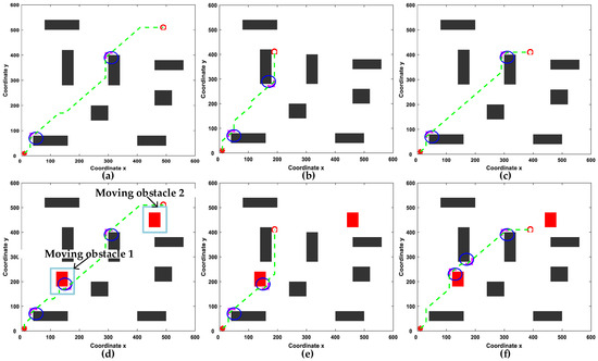 Comparison of R-SAC and DGA-ACO using the map from reference [10]. (a) Static experiment with target (500,500); (b) static experiment with target (200,400); (c) static experiment with target (400,400); (d) dynamic experiment with target (500,500); (e) dynamic experiment with target (200,400); (f) dynamic experiment with target (400,400).