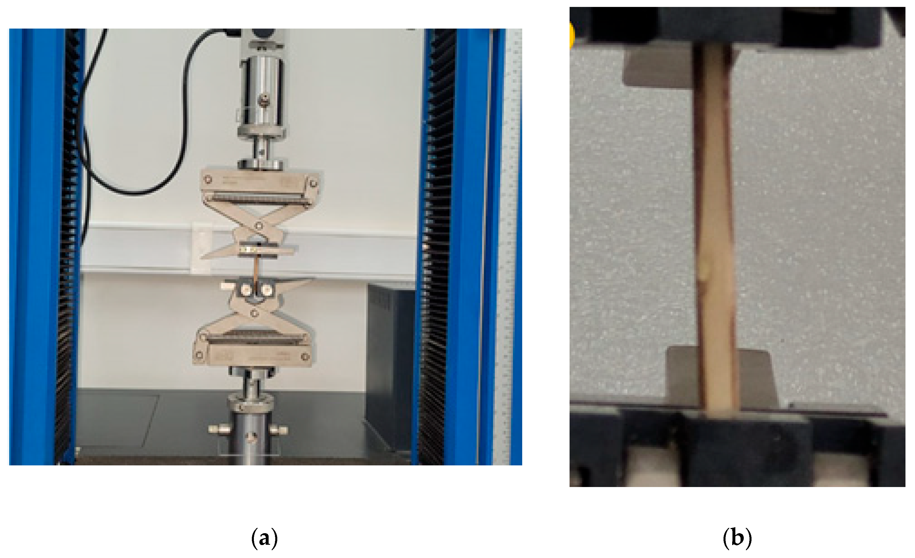 The elastic modulus was determined from the line of slope secant to the curve (dashed in red), which relates the stress as a function of the specific deformation (Figure 11a). This straight line was defined based on the points located at 10 and 50% of the tensile strength, parallel to the fibers, following the guidelines prescribed by ABNT NBR 7190 [27]. The tensile test allowed the inference of the elastic modulus of the material, and its estimate was calculated as 447.89 MPa.