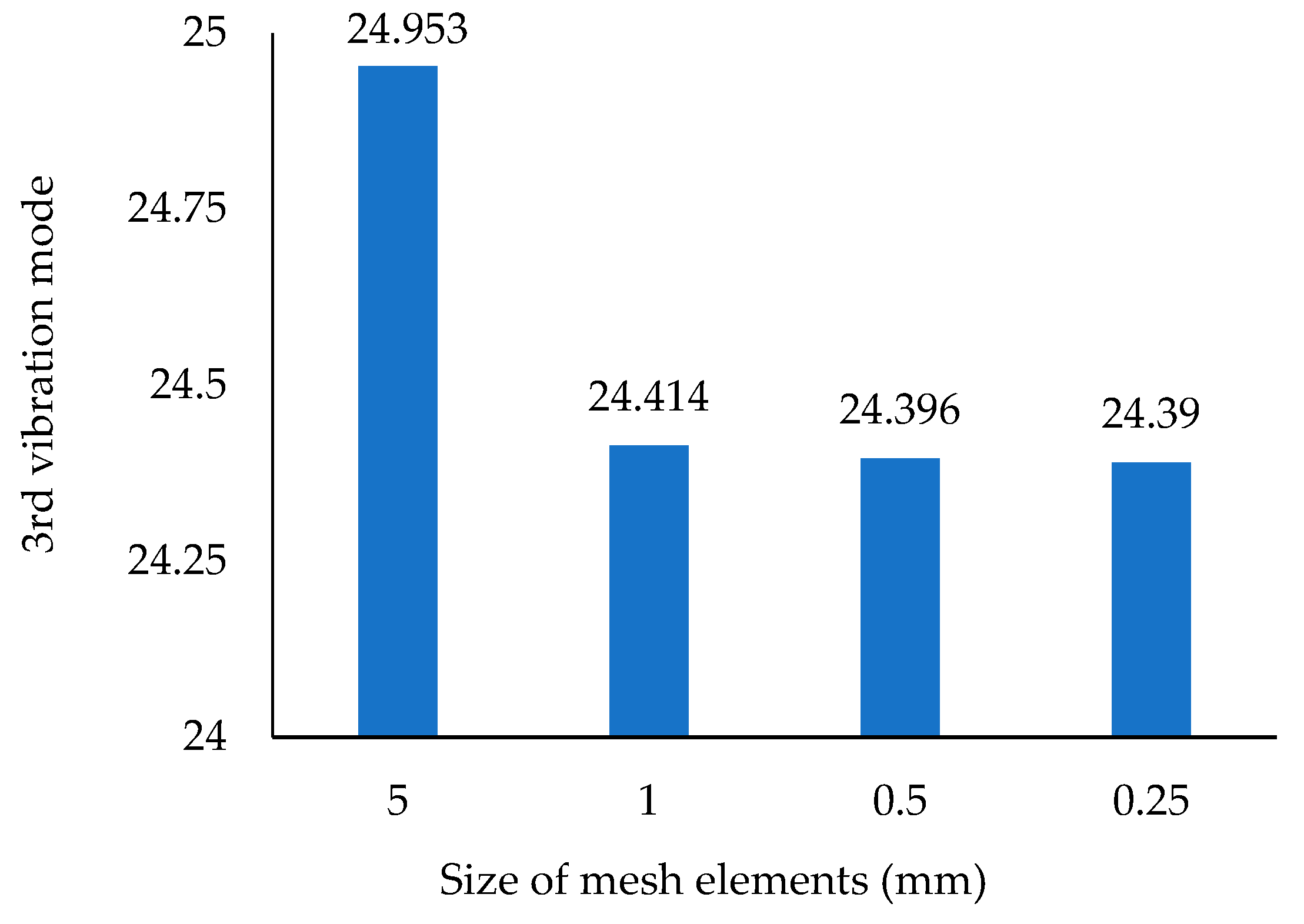 Melo et al. [17] considered a single geometry, from which the mechanical property data were altered and simulated again. This fact explains how the results of natural frequencies differed from the data of the present study. The natural frequency can also be influenced by the stiffness and mass of the geometry, since the stiffness is directly proportional and the mass is inversely proportional to the natural frequencies. Thus, it is possible to understand that for branch R1, in which all the results were lower than the experimental one, the mass could be decreased, bringing the frequencies obtained via simulation closer to the experimental data. The stiffness module adjustment could also be an option, which could be slightly lower to mitigate this difference.