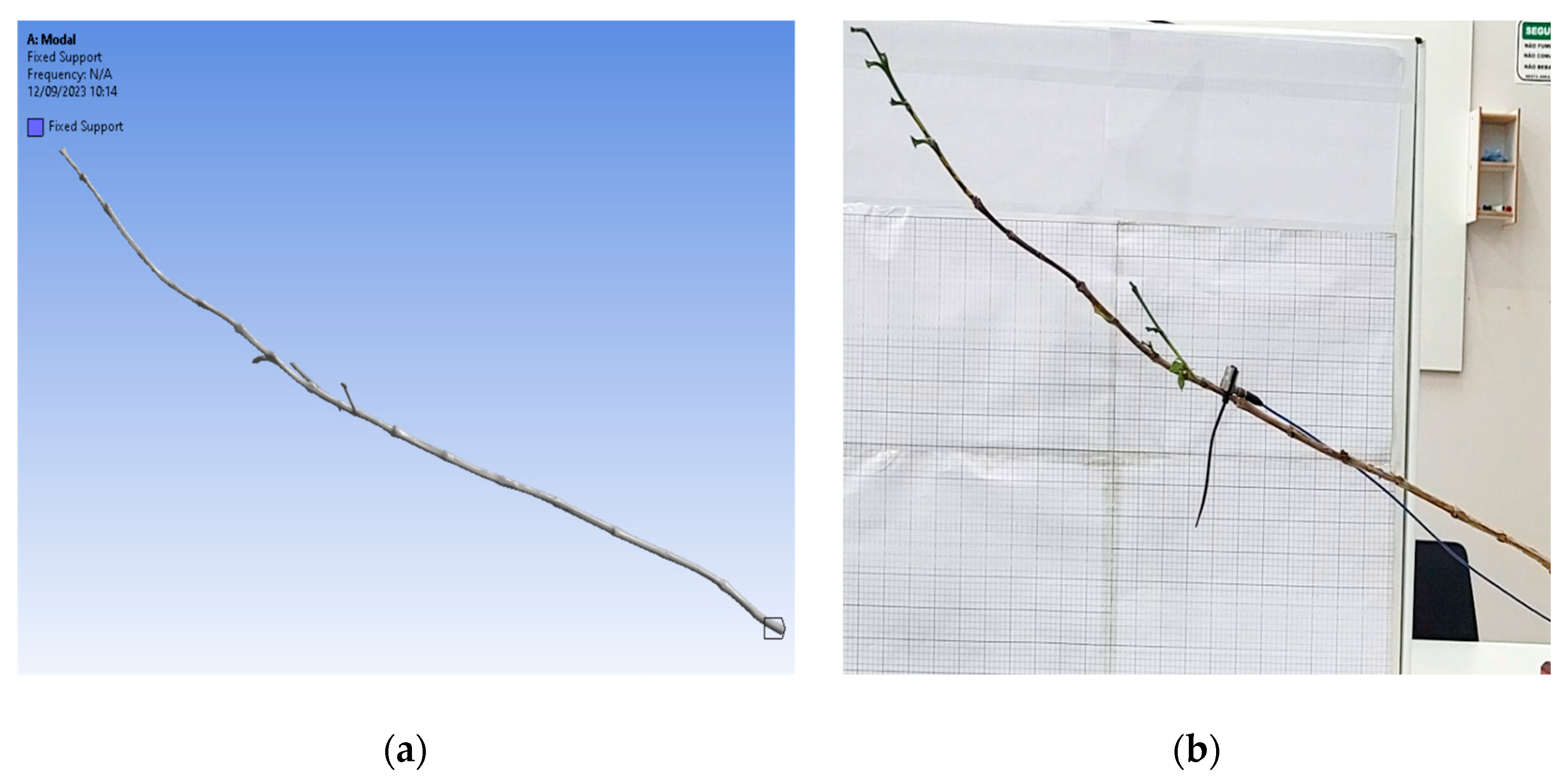Coffee branches, being biological materials, possess complex geometries and material properties that can introduce challenges. While this study primarily employs linear FEM analysis (Equation (1) assumes linear elasticity and small displacements), it is acknowledged that wood can exhibit anisotropic and potentially non-linear behavior under certain loading conditions. The intricate branching structure also contributes to the complexity. The scanning technique aims to capture the geometric details accurately, while the linear FEM provides a fundamental understanding of the dynamic response, serving as a basis for comparison with experimental data and potential future non-linear investigations.