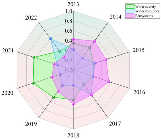 As illustrated in Figure 2, the obstacle factor values of the three subsystems in the Chengdu-Chongqing region show a general trend of convergence over the study period. For most years, either the ecological environment system (purple) or the water society system (green) served as the primary obstacle to water resource carrying capacity. However, in 2022, the water resources system (blue) experienced a marked increase in its obstructive effect, becoming the dominant constraint.