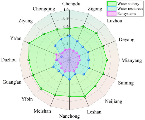 In summary, the analysis highlights that the water society system remains the foremost constraint to water resource-carrying capacity across the region. Achieving sustainable and high-quality development requires municipalities to comprehensively assess the interplay among the three subsystems. Policymakers should strengthen governance structures and optimize resource allocation, guided by localized strategies and natural endowments. Such efforts are crucial not only for enhancing water security but also for ensuring ecological resilience and supporting agricultural sustainability in the Chengdu-Chongqing region.