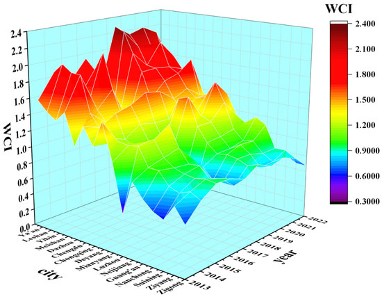 Upon detailed examination of Figure 4, WCI within the Chengdu-Chongqing region demonstrates a generally upward trajectory over the past decade, albeit punctuated by intermittent regressions in specific years (e.g., 2015, 2017, 2019, 2021, and 2022). These fluctuations suggest not only the uneven effects of regional policy and climatic variability but also the differential resilience of municipal water systems. Spatial heterogeneity remains pronounced: cities such as Ya’an, Leshan, and Yibin consistently rank higher in WCI, likely due to favorable hydrological and topographical endowments. Conversely, Zigong and Ziyang persistently occupy the lower end of the spectrum, warranting closer scrutiny.