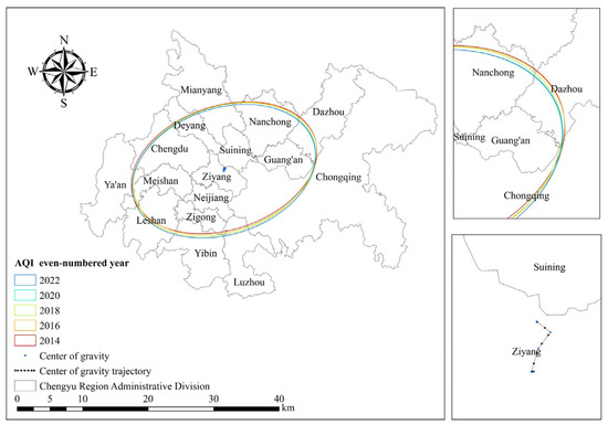 To precisely elucidate the spatial evolutionary trends of agricultural development quality and water carrying capacity in the Chengdu-Chongqing region, this study integrates Geographic Information System (GIS) technology with the standard deviational ellipse model (SDE). This approach facilitated the creation of four elliptical distribution maps depicting QAI and WCI for odd and even years, alongside maps illustrating their centroid migration trajectories. The results are presented in Table 2 and Figure 6, Figure 7, Figure 8 and Figure 9.