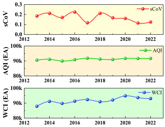 This research adopts the Spatial Coefficient of Variation (sCoV) [60] to quantify the degree of spatial heterogeneity in the distribution of AQI and WCI. This metric, calculated by the ratio of the intersection area to the union area of the ellipses, can precisely reflect the temporal variations in the spatial alignment of both systems. For instance, an increase in the sCoV value indicates an expanding difference, while a decrease suggests an improvement in coordination. Compared to the traditional coefficient of variation, the sCoV offers a significant advantage by integrating spatial topological relationships, which directly link to the effectiveness of regional policy implementation. Another key reason for choosing this model is its methodological complementarity with the standard deviational ellipse: the former depicts the spatial distribution’s morphological characteristics, while the latter quantifies the degree of system matching.